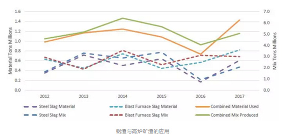 該調(diào)查還表明,在2017年的施工季節(jié),新瀝青路面混合料中使用了近7900萬(wàn)噸再生材料,與2016年的數(shù)量差不多。2017年,美國(guó)除了繼續(xù)將RAP和再生瀝青瓦(RAS)應(yīng)用于新路面,還使用了其他再生材料——包括輪胎橡膠、鋼渣、高爐礦渣以及再生纖維素纖維(Cellulose Fiber)。其中,僅RAP與RAS兩項(xiàng)就比應(yīng)用原始材料節(jié)約超過22億美元的成本。雖然沒有統(tǒng)計(jì)全國(guó)的用量,但是根據(jù)調(diào)查受訪者的反饋信息,約有150萬(wàn)噸輪胎橡膠、礦渣、纖維素纖維和其他廢棄材料被循環(huán)利用到將近750萬(wàn)噸的瀝青路面混合料中。