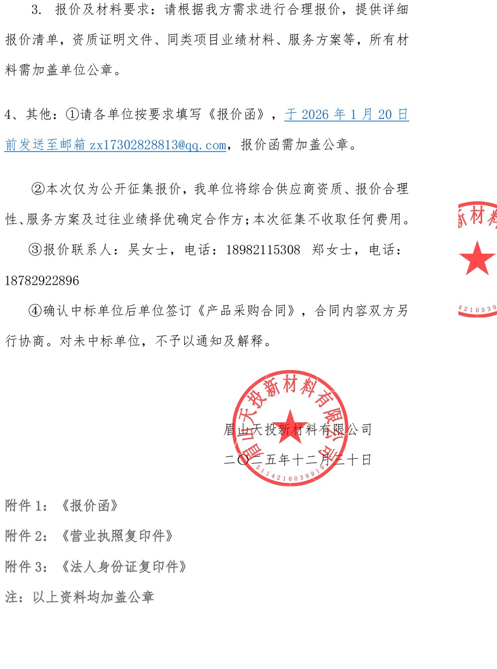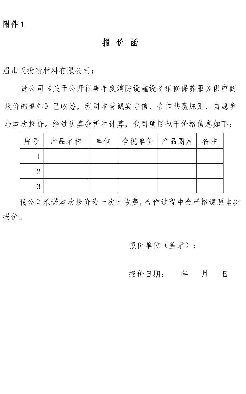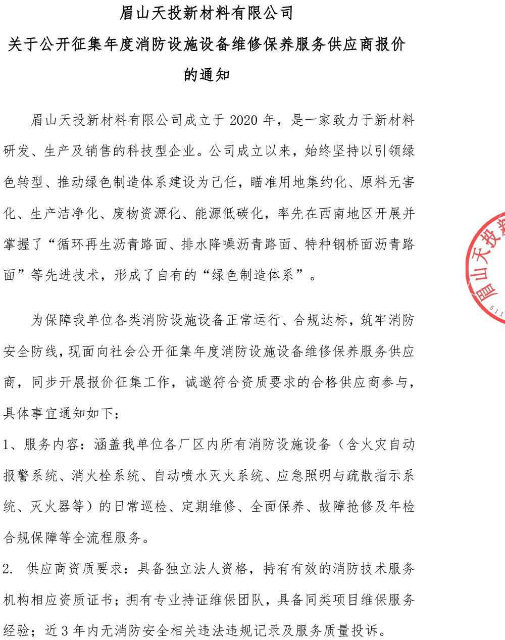眉山天投新材料有限公司關于公開征集年度消防設施設備維修保養(yǎng)服務供應商報價的通知